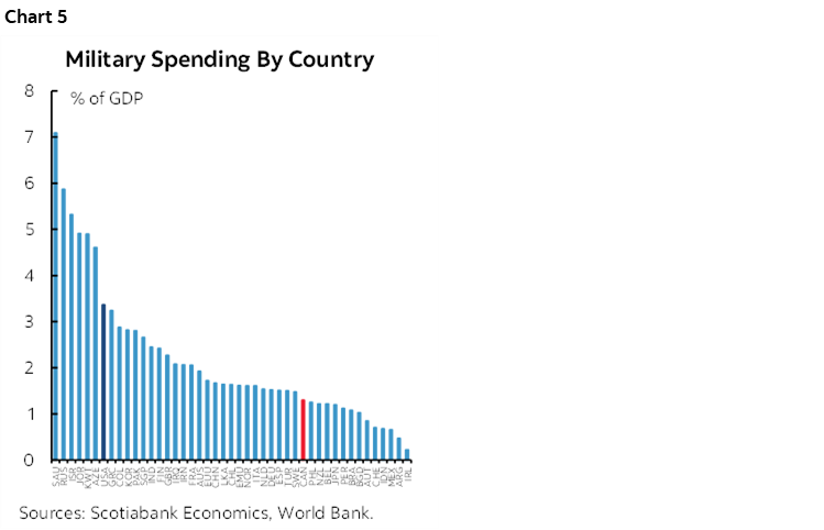 The US spends 3.4% of GDP on defence. Canada spends 1.3%, and other countries include the UK at 2.3%, Germany at 1.5%, Italy at 1.6%, France at 2.1%, Japan at 1.2%, and South Korea at 2.8%. Russia spends 5.9%. See chart 5.