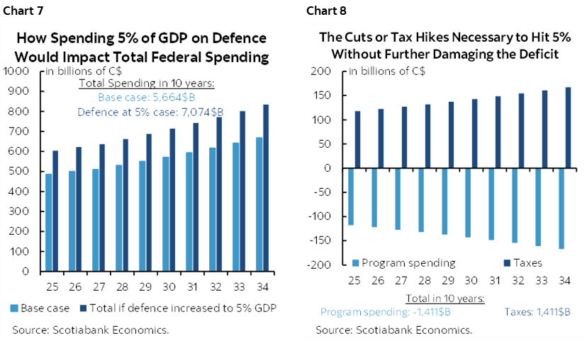 Chart 7 shows what would happen to federal government spending under base line program spending projections plus incremental defence spending to hit 5% of NGDP relative to a baseline of 1.3%. Chart 8 shows what would have to happen to program spending or taxes if total spending were kept constant while raising defence spending to 5% of GDP. To fund a four-fold increase in defence spending to hit the 5% Trump target would mean about C$1½ trillion of tax hikes or equivalent program spending cuts or some combination thereof. That would mean a cumulative cut of 25% to program spending over the next full decade that would require eliminating core programs. If instead the deficit were allowed to blow out, Canada would very likely lose its AAA rating—higher than the US—while putting upward pressure on borrowing costs for households, businesses and governments.