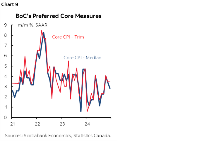 Regardless, the issue at hand that is much more difficult to estimate is whether the BoC’s preferred core measures will remain hot again. There is no doubt in my mind that underlying price pressures remain acute in Canada. The BoC has raised some issues with trimmed mean, but weighted median is also trending too warmly (chart 9). Every single month since May has seen the m/m seasonally adjusted and annualized readings for trimmed mean and weighted median CPI rise at 2%+. The three-month moving averages for weighted median CPI and trimmed mean CPI are both 3.2% m/m SAAR.