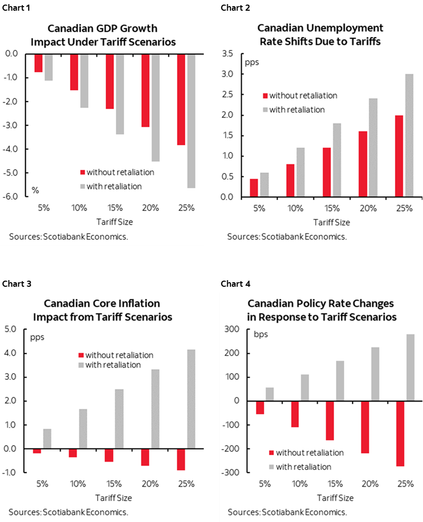 The traditional economist response is to just take it when another country imposes trade restrictions. Don't retaliate. You'll make things worse. Tariffs on US imports into Canada will drive prices higher, squeezing purchasing power, imposing further damage on consumption, business investment, growth, unemployment, etc. An ugly situation would be made uglier. At least in the short-term, this school of thought is right about the effects. Charts 1–4 provide our estimates of the impact of across-the-board US tariffs on Canadian growth, inflation, unemployment, and the Bank of Canada’s policy rate under both no-retaliation and full retaliation scenarios.