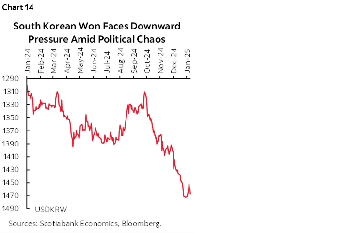 The Bank of Korea will deliver a policy decision on Thursday. It’s expected to cut by 25bps to 2.75% after cutting twice before, taking the policy rate down by a cumulative 75bps since October if they cut this week. Since the last meeting in late-November, both headline and core inflation have picked up from 1.3% to 1.9% and 1.7% to 1.8% respectively, although they are still below the 2% target. In addition, the won has been tumbling since October by a cumulative 12% depreciation to the dollar both on domestic political developments and external concerns related to a less dovish Federal Reserve and trade policy risks (chart 14).