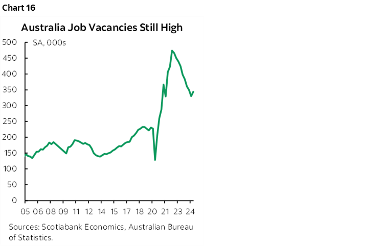 Is Australia’s jobs juggernaut still steaming full speed ahead? We’ll find out when December numbers arrive on Wednesday. Jobs have increased every month since April and almost 400,000 jobs were created over the first eleven months of 2024. Like Canada, Australia’s job market has been offering very strong supports to the economy. If unfilled job vacancies are any indication then Australia could keep on posting solid job growth (chart 16).