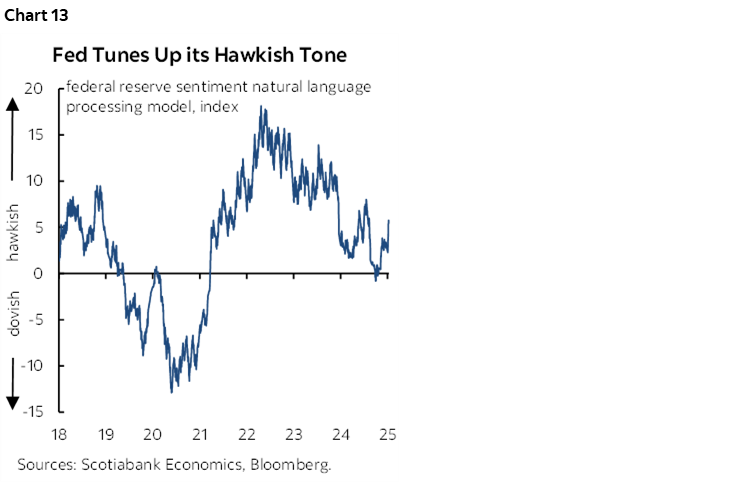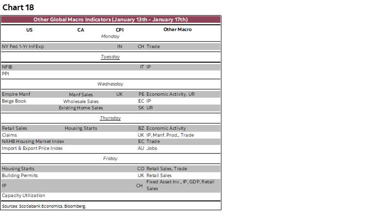 Enjoy it while it lasts. By that I’m referencing the relative absence of major central banks weighing in with fresh communications and decisions. That will soon change when the Bank of Japan delivers a decision at the end of the week after next, followed by the Fed and the BoC that issue decisions on January 29th following by the ECB the day after and the BoE the week after that. The Fed’s bias has turned relatively more hawkish (chart 13) and is likely to turn even further in this direction following a strong jobs report (recap here).