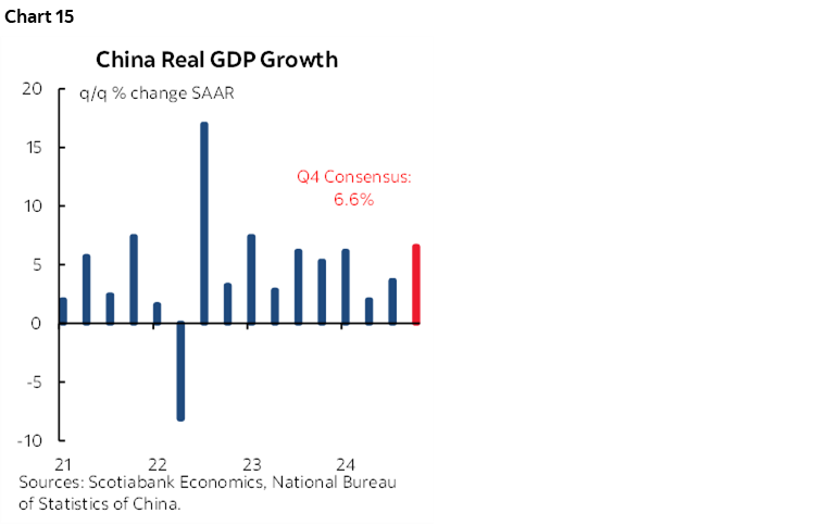 China’s economy may have modestly accelerated to end 2024 (chart 15). Q4 GDP will be offered on Thursday evening (ET). Consensus estimates range from about 1.3 to 2% q/q at a seasonally adjusted but nonannualized rate. Equally important in terms of informing momentum into Q1 will be monthly indicators for December, especially retail sales and industrial output. Expect new and resale home prices to keep falling.