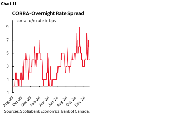 - There is no greater pressure on the Canadian Overnight Repo Rate Average relative to the policy overnight rate (chart 11). The spread is small at +3bps, and there has been a small positive spread for almost a year-and-a-half since the late summer of 2023. It’s neither widening or narrowing and it hasn’t caused much concern at the BoC before. The BoC has basically indicated it can live with a small deviation and it’s not changing.