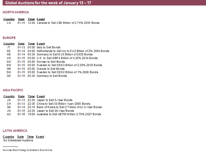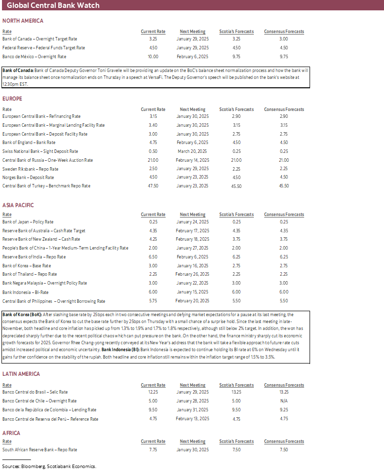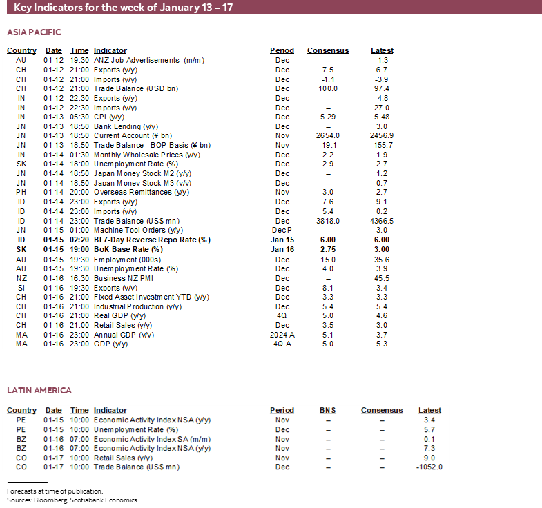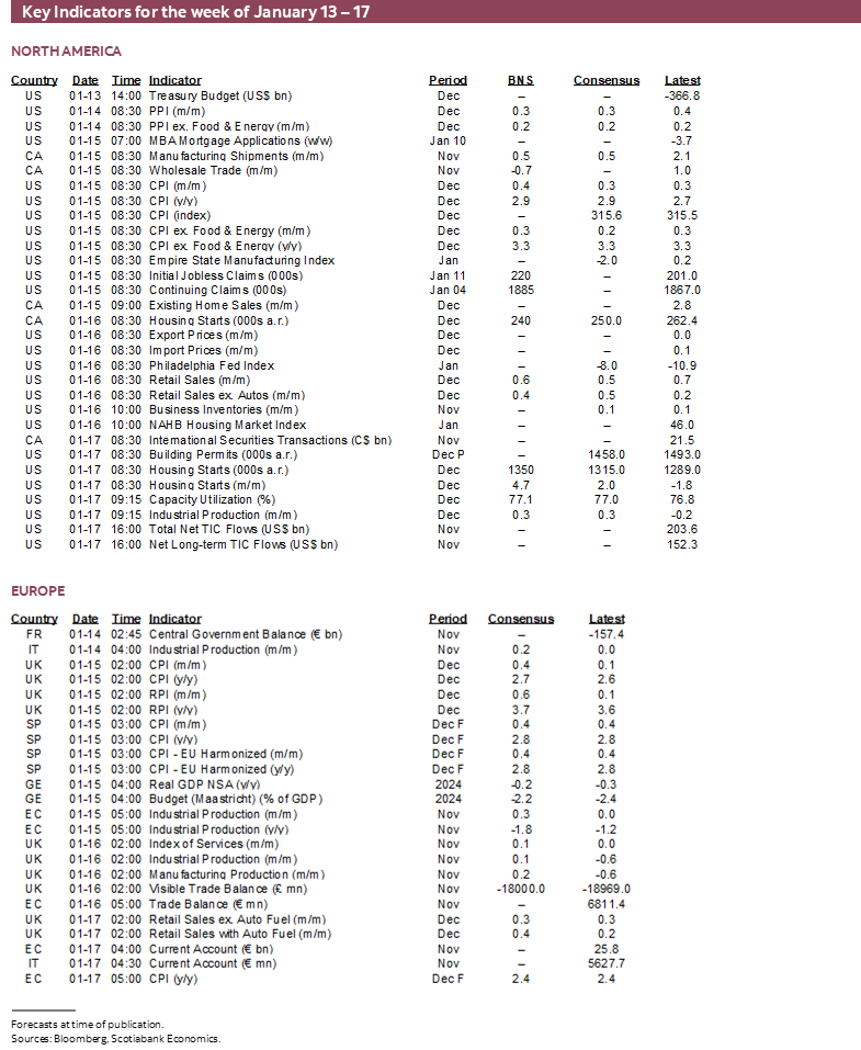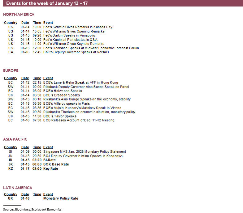 Markets will probably digest a fair number of off-calendar tape bombs this week if the first full week of the new year was any indication of what to expect. It’s the last full week before President-elect Trump’s inauguration on January 20th and the likelihood that he acts fast to deliver executive orders on numerous policy matters possibly including tariffs. It’s also a period of relative calm for decisions by major central banks until they whir to action again into month-end.
