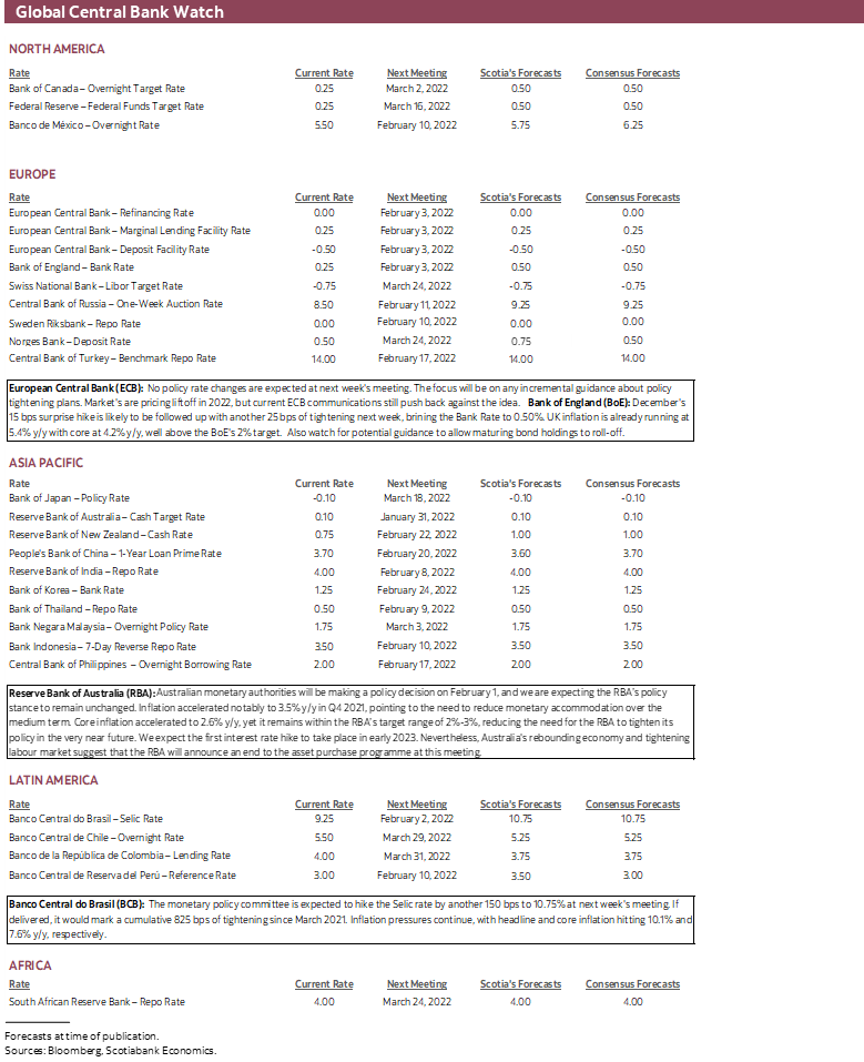 Latin American markets will focus upon the ripple effects of central bank tightening (Chile and Colombia this past week, Brazil this coming week) but limited data could also factor into market sentiment. Mexican Q4 GDP growth is forecast to decline by another 0.4% q/q SA non-annualized (Monday) and PMIs arrive the next day to inform how the economy is coping with omicron into the new year. Peru’s inflation rate (Tuesday) is forecast to slip back beneath 6% y/y with a more temperate pace of month-over-month increase.