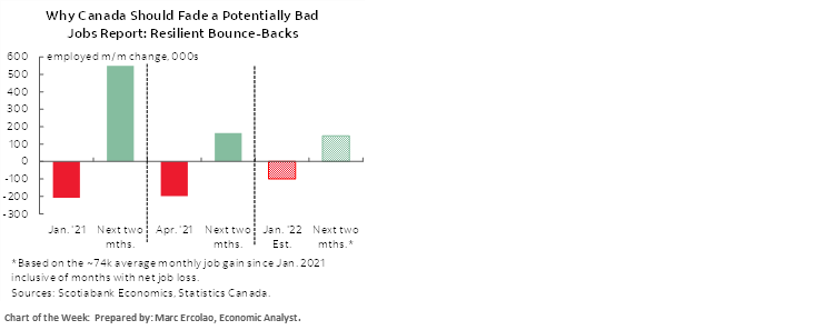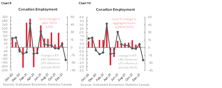 My guesstimate is that we’ll see something on the order of 150,000 lost jobs. While this will be driven by omicron and related restrictions and is likely to be transitory, it will complicate the optics around a potential BoC rate hike at the March 2nd meeting. They may have held the policy rate this past week because of omicron concerns, despite evidence it is probably fading (e.g. hospitalizations and wastewater tests) while being an added inflationary impulse, but will they then hike when the only jobs report they’ll get before March 2nd is potentially a large drop?