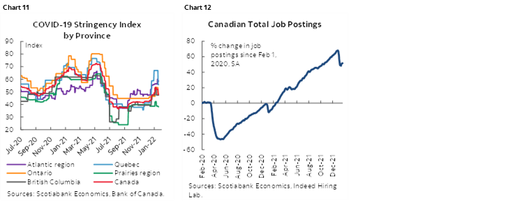 The steep plunge in this composite reading suggests we could see the largest decline in employment witnessed since the earliest days of the pandemic. Some of this is because of self-preservation as many people generally hunkered down through omicron. Some of this is due to tightened restrictions across the country (chart 11) and relative to the United States (see earlier chart 6). We can also observe a larger than usual drop in job postings (chart 12).