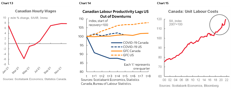 Also watch wages. Month-over-month wage growth has been in the 6–9% seasonally adjusted and annualized range for six months now as a clear sign it has accelerated (chart 13). With Canadian labour productivity tanking (chart 14), unit labour costs (a productivity-adjusted measure of employment costs) are accelerating (chart 15). We should probably expect more of this through 2022–23. And, no, sorry to burst anyone’s bubble but there is no material estimated effect of immigration on wages in the literature even if the rise in Canadian immigration to date wasn’t fake since about 75% of the past year’s “surge” was only due to converting temporary status to permanent.
