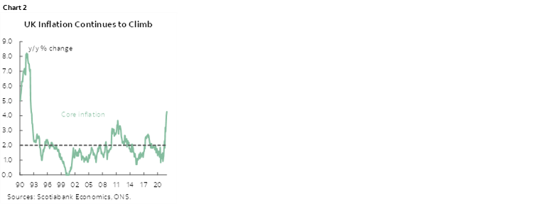 A fresh round of forecasts will inform policy directions. Near-term growth downgrades and stronger inflationary impulses are likely. UK inflation is already running at 5.4% y/y with core at 4.2% y/y which is the highest core reading since June 1992 and far above the BoE’s 2% target (chart 2). That could also provide the impetus to start allowing quantitative tightening through allowing maturing bonds to start dropping off the balance sheet.