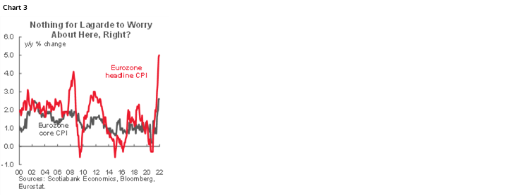 Markets will pay keen attention to whether Lagarde repeats guidance from her remarks last month when she said “It is very unlikely that we will raise the interest rates in the year 2022.” On January 20th, Lagarde again emphasized how the Eurozone faces very different conditions than the Fed does while leaning against rate hikes this year. The complicating factor is that Fed Chair Powell subsequently turned more hawkish this past week (recap here) and the resulting USD strength is contributing to greater euro weakness. The euro is now trading at its weakest level since last June (chart 3). Amid building inflationary impulses, the risk of somewhat greater import price pass-through effects could well soften her conviction against any chance of a rate hike this year.