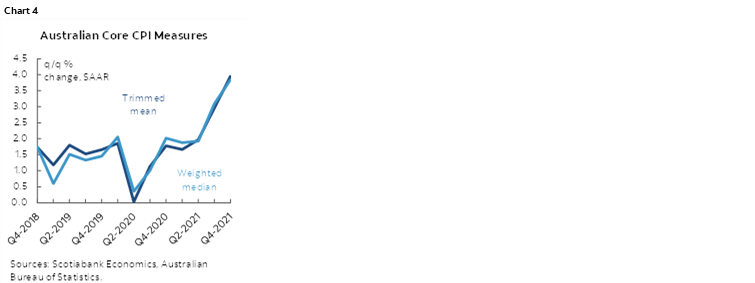 Third and “most importantly” the RBA said it would monitor actual and expected progress towards the goals of full employment and price stability. Inflation is soaring especially when q/q annualized increases in the central tendency measures are considered (chart 4). Further, Australian jobs have climbed by 431k in two months and more than recaptured the 360k drop during restrictions over the prior four months which will likely offset potentially transitory omicron effects into early 2022.