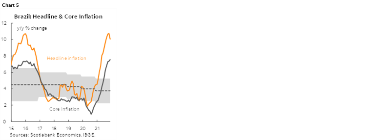 The BCB’s decision on Wednesday will likely see the Selic rate hiked by another 150 bps to 10.75%. If delivered, it would mark a cumulative 825 bps of tightening since March 2021 and would cement the BCB as the most aggressive policy tighteners amongst major economies to date. Inflation continues to run hot, with headline (10.1% y/y) and core (7.6% y/y) inflation in December well above the bank’s target range (chart 5). In a mandatory year-end open letter penned by the BCB to the public providing explanations for its inflation target miss, the bank stressed a “significantly restrictive” monetary policy to control prices over the coming years. Forecasters expect the Selic rate to reach anywhere between 11.50–12.00% by mid-2022 and be held there into the following year before potential loosening.