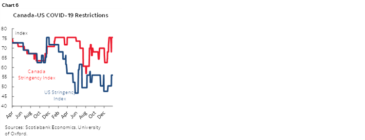 The United States did not meaningfully embrace tightened restrictions against the omicron wave like its northern neighbour and many European economies did. Chart 6 shows a comparison of US and Canadian stringency measures. On the surface, this might mean that the US job creation machine could keep moving in a forward direction—and it might. If so, then that would be strong evidence of resilience.