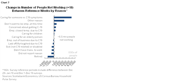 Chart 7 depicts the results. There was a massive ~6 million surge in the number of people who said they were not working in the January nonfarm reference period compared to December because they were caring for someone who was sick with COVID-19 symptoms. A net total of 6.5 million additional people said they were not working in January over December for any of the listed reasons. Many of these reasons are subject to normal volatility, some of which can be seasonal, but it’s the swings in the pandemic-related responses that are meaningful and that have generally served as a useful indicator for estimating swings in payrolls.