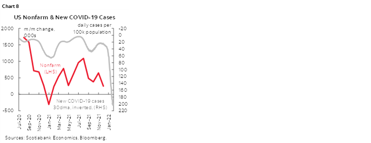 Secondly, chart 8 shows that when pandemic cases rise they tend to drive weaker payrolls. The rise in reported cases this time around is definitely more understated than prior waves but is nevertheless off-the-charts. That could mean that the risk to the above nonfarm estimate may be skewed toward a materially worse number than the forecast that is always issued with trepidation even under more ‘normal’ circumstances.