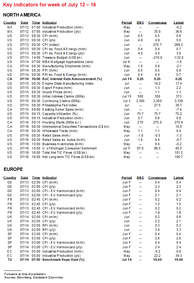 Canada will update a few relatively minor indicators. Manufacturing sales during May (Wednesday) will probably rise by ~1% m/m based on preliminary guidance from Statistics Canada. Wholesale trade during May (Friday) is expected to rise by ~1.1% m/m. Housing data is more uncertain but solid building permits should keep housing starts elevated around the 275k range (Friday) while most of the reopening effect for existing home sales may lie beyond Thursday’s resale figures for June.
