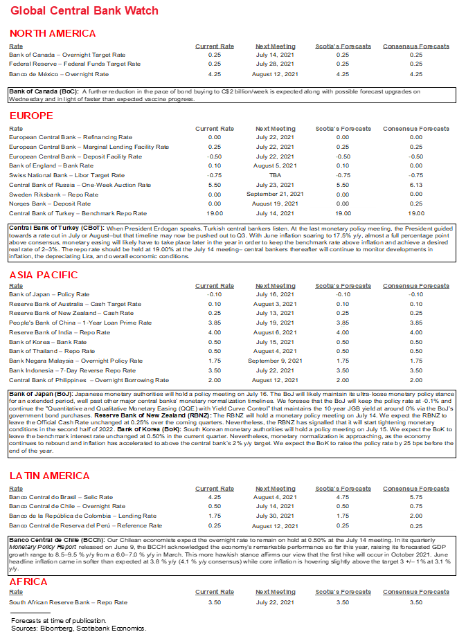 1. They have said that adjustments to net bond purchases “will be guided by Governing Council’s ongoing assessment of the strength and durability of the recovery.” This implies benchmarking progress to their forecasts to date. We are tracking about 3½% GDP growth in Q2 and hence in line with the BoC’s forecast published in the April MPR. At that time, they said they expected restrictions to ease in late May which they did. As a consequence, 80% of the jobs lost in April and May during third wave restrictions have already been recouped in one report for June.