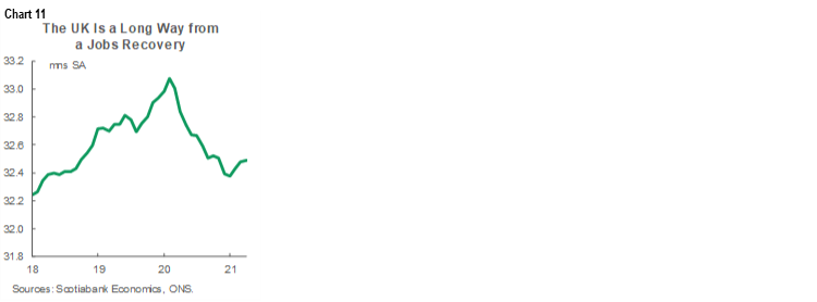Thursday will bring forth several updates on the state of the UK job market. Job growth and the unemployment rate plus wages during May will be updated along with jobless claims during June. The UK has been a slowpoke in terms of relative job market recoveries by comparison to other Anglo-American economies (chart 11). Then again, the UK is “only” just under 600k lower than where employment stood in February 2020 which, scaled to population, remains a milder overall hit than Canada experienced. A further gain is expected in light of ongoing relaxation of restrictions but the forward-looking emphasis is likely to remain upon whether the UK remains on track to end all social distancing requirements by July 19th as planned, given the ongoing rise of the Delta variant.