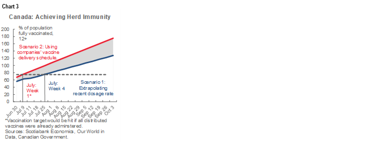 2. The April MPR indicated that the BoC expected “broad immunity…later in 2021 in Canada.” The country is getting to this point sooner than they anticipated. In fact, Canada will likely cross the 75% herd immunity proxy for double dose vaccinations soon after the meeting (chart 3). That could give cause to upgrade implied growth forecasts for Q3 onward. They are likely to repeat that the inputs to an output gap framework remain uncertain at this point such that there is little to be gained from deviating from prior guidance that spare capacity will close by 2022H2.
