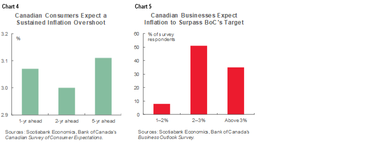 3. While they are hardly airtight measures, the BoC’s surveys of inflation expectations point toward the risk of unmoored inflation expectations above the 2% mid-point target of the 1–3% band. Consumers expect 3% inflation across all time horizons while 86% of businesses expect inflation to exceed 2% over the next two years with a record 35% above 3% (charts 4, 5).