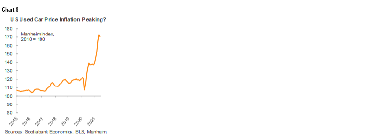 US CPI will inch along the path of informing inflation expectations through hard data (Tuesday). The headline year-over-year rate is expected to top out at 4.9% (5.0% prior) but with another notable month-ago gain of about ½%. Key, however, is core inflation and that is expected to continue climbing toward 4% y/y with another 0.4% m/m rise. June is typically a soft month for seasonal price changes in a ‘normal’ year and so we’re left with base effects, gas prices and figuring out supply chain and reopening effects to inform the estimate. One reason that the pace of month-ago increases may ebb compared to the prior two months when core prices were up 0.7% m/m and 0.9% in May and April, respectively, is that used vehicle prices appear to have slightly cooled off (chart 8). Also keep an eye on Wednesday’s final demand producer prices for June in terms of potential pass-through risk from supply chains into CPI.