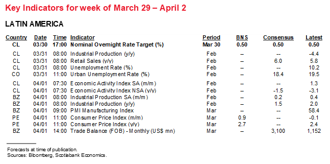 This report has been prepared by Scotiabank Economics as a resource for the clients of Scotiabank. Opinions, estimates and projections contained herein are our own as of the date hereof and are subject to change without notice. The information and opinions contained herein have been compiled or arrived at from sources believed reliable but no representation or warranty, express or implied, is made as to their accuracy or completeness. Neither Scotiabank nor any of its officers, directors, partners, employees or affiliates accepts any liability whatsoever for any direct or consequential loss arising from any use of this report or its contents.