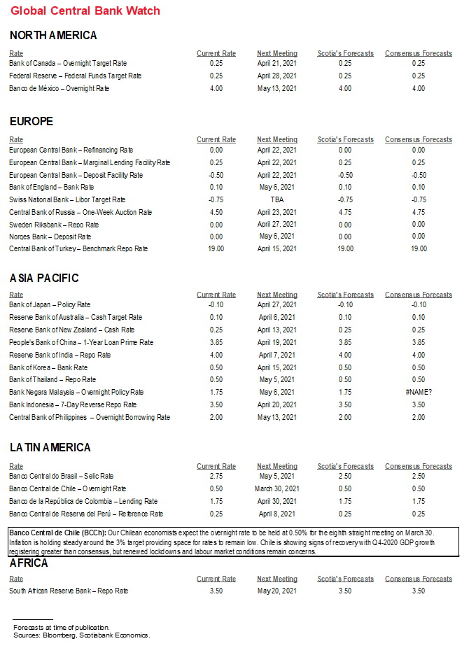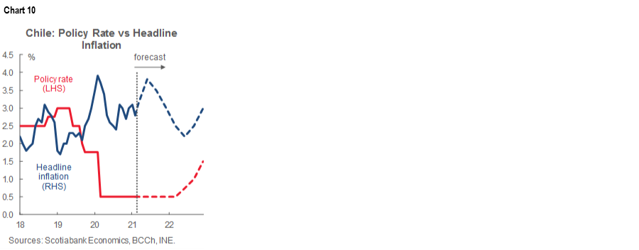 Only one central bank will offer a policy decision. Chile’s central bank is universally expected to stay on hold at an overnight rate of 0.5% on Tuesday. Inflation is roughly within the target zone but the decision to put Santiago back into lockdown due to rising COVID-19 cases will be an added near-term risk to the economy. The policy rate is expected to stay on hold over the duration of the year before potentially rising next year (chart 10).