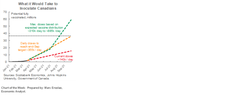 What does it all mean for Q1? Something a lot better than the Bank of Canada had figured when it forecast a contraction of 2 ½% for Q1 GDP in the January Monetary Policy Report. Canada could be at ten months of uninterrupted growth from May through February as not even the second wave of cases bumped it off course. Even before considering Q1 data, the quarter had 1.3% annualized growth baked in due to momentum into the end of last year as it transitioned to Q1. Our forecast for the full first quarter is for growth of about 4½%. If January faces upside, February builds upon it and then factors like easing restrictions and more pleasant than usual weather for part of March build upon the momentum, then we could well be looking at even faster growth depending upon how other GDP drivers like inventories and imports evolve.