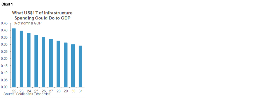 The outlines of Biden’s plan will likely serve as the next major catalyst for potential forecast revisions to everything from growth, inflation, the Fed, Treasury yields and the dollar as we learn more about the amounts, composition, timing and how it may be funded—let alone the probability of pulling it off! For now—and merely to whet one’s appetite—chart 1 provides one crude way of benchmarking what every US$1 trillion spent on infrastructure over a ten year period of time would represent as a share of annual nominal GDP grown at a long-run average pace if proceeds are spent evenly each year. Obviously, we don’t know the amounts, composition or distribution over time and have not factored in multiplier effects absent details, so treat this as a casual reference at this point to show the effects scaled to the economy. One scenario, however, would see less than a ½% lift to GDP that does not repeat annual growth effects if the amounts spent the prior year are merely replaced in subsequent periods.