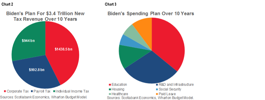 Reconciliation is probably going to have to be the route that the administration goes. Because of the neutrality requirement, this bill offers a chance at achieving much of what’s left on Biden’s election platform—including higher taxes on corporations and upper income earners. Republicans are sure to oppose the revenue measures that, among other things, would claw back the Tax Cuts and Jobs Act of 2018. Good luck getting 10 votes out of the GOP in order to avoid going the reconciliation route. Recall that the accompanying table and charts 2 and 3 on the next page summarize the revenue and expenditure aspects of Biden’s platform in order to demonstrate what is at stake.