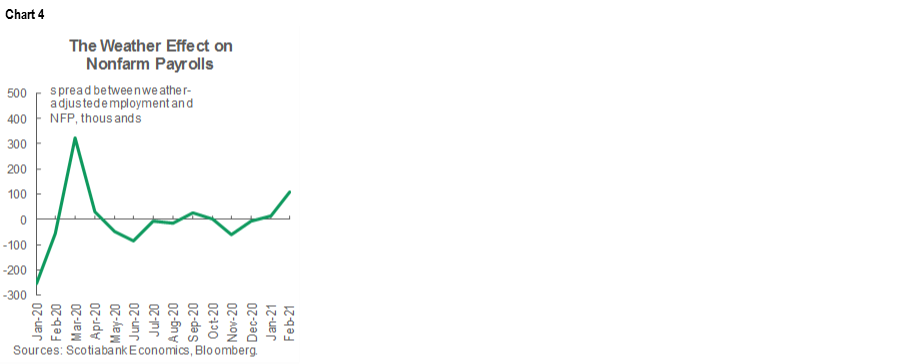 For one, March payrolls should regain the jobs that were reported as lost due to weather effects in February. Severe snowstorms were cited as a dampening effect on February payrolls by the Bureau of Labor Statistics since they hit into the reference period that is the pay period including the 12th of each month. One manifestation of this was the disruption to the power grid in Texas. The San Francisco Federal Reserve estimates that February’s payrolls were just over 100k lower than they would have been absent such harsher-than-seasonally-normal weather. This effect was among the largest negative weather effects in recent times (chart 4). Those lost jobs could reasonably be regained in March.