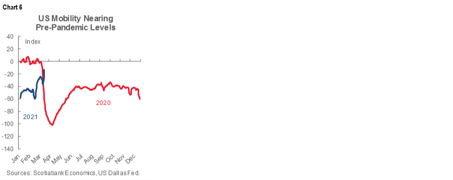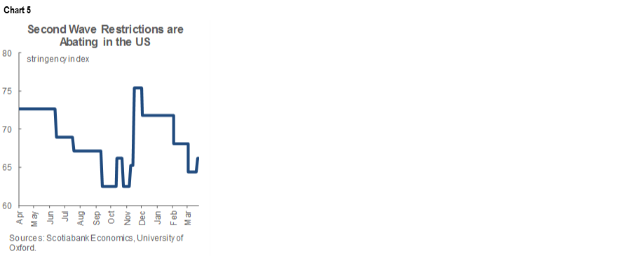 Secondly, COVID-19 restrictions eased further into the March reference period (chart 5). Restrictions have fallen back toward November levels. If they decline a bit further, then restrictions will have fully unwound second-wave effects back to where they stood in September and October of last year when the US was posting monthly job gains of about 700k.