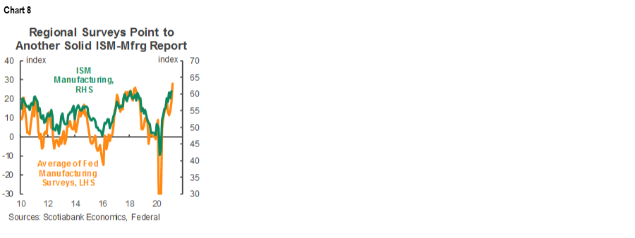The US ISM-manufacturing gets released on Thursday and could well rise to its highest reading since December 1983 for a nearly four-decade high that builds upon recent momentum (chart 8). The drivers include gains in regional surveys like the Philly Fed measure that almost doubled in March to its highest reading since 1973, the Empire gauge that jumped by 5 points to its highest reading since November 2018, plus smaller gains in the Richmond and Kansas City measures. Further, since the regional surveys tend to underrepresent the transportation sector, an expected rebound in auto sales on Thursday could also be reflected in a stronger ISM print.