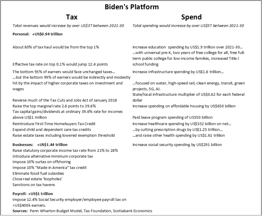 The Biden Administration will no doubt start off by seeking bipartisan support but can use the budget reconciliation process a second and final time this year in order to pass legislation with just the 50+1 standard instead of a 60-vote threshold in the Senate. Reconciliation relies upon satisfying the Byrd rule named after former senator Robert Byrd and that requires proposals are germane to the budget (i.e., excluding things like minimum wage adjustments) and must be budget neutral over a 10-year period (or at least until some future government changes policies again…).