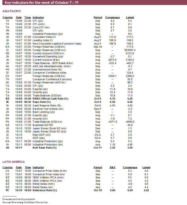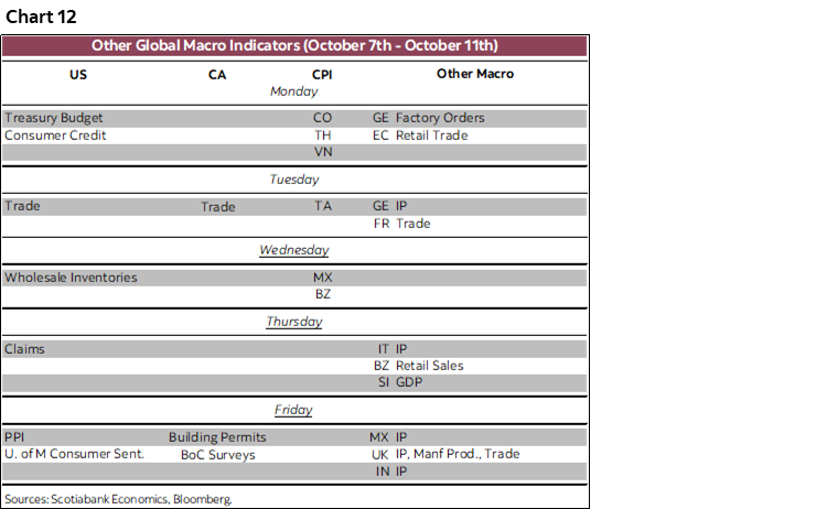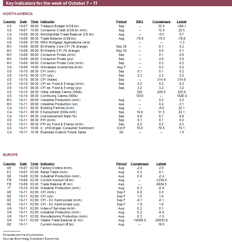 Friday may be key to forming expectations for the Bank of Canada’s next policy decision on October 23rd. It starts with the jobs report for September followed two hours later by the Bank of Canada’s fresh consumer and business surveys including measures of inflation expectations that they follow closely. The reward to getting through all of that will be to go straight into the Canadian Thanksgiving long weekend.