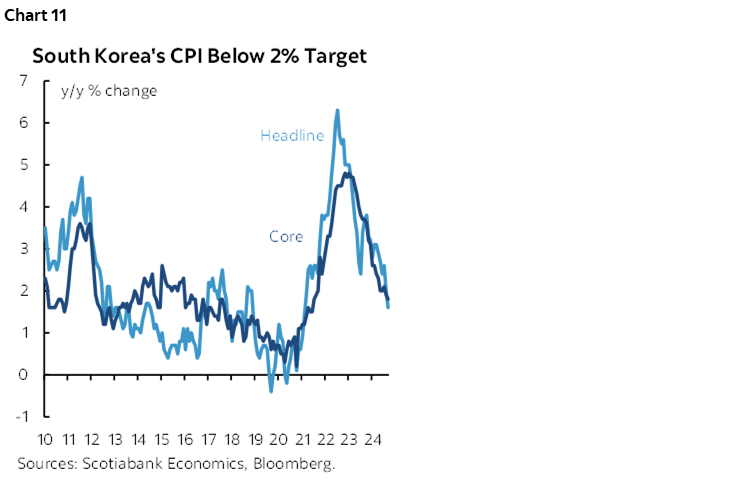 Most economists expect the Bank of Korea to cut its base rate by 25bps on Friday. The central bank teed up possible easing at this meeting while communicating its decisions at the last meeting on August 22nd. The BoK said it had “greater confidence that inflation will converge on the target level” and that it will “examine the proper timing of rate cuts while maintaining a restrictive policy stance.” Inflation has been rapidly decelerating (chart 11).