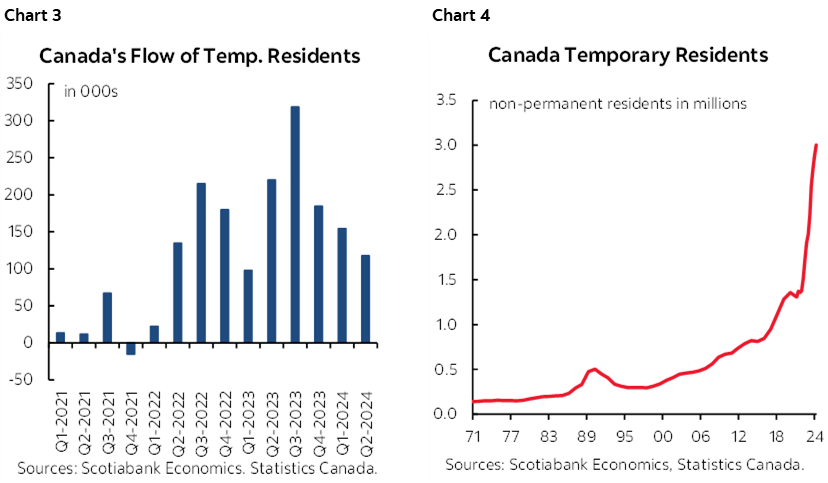 One indication of why this last point was made is provided in chart 3 that shows that the flow of new temporary residents has indeed been declining for three consecutive quarters up to the latest available which is 2024Q2 even as the outstanding number of temporary residents keeps climbing (chart 4). It’s reasonable to expect the flow to continue to decline and drive outright declines in the outstandings. Another indication of this may have been reports across university towns of lower rents across student residences due to softer demand into the new school year.