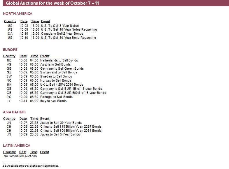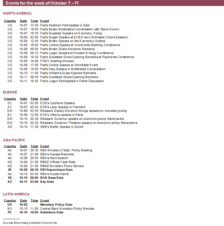 Banxico minutes to the September 26th meeting when the overnight rate was cut by 25bps arrive Thursday. Since that meeting, Deputy Governor Heath said that policy had to remain restrictive in order to “break the persistence of services prices.” He also said that if the Fed continues to cut, then “not with a perfect correlation by any means, we will also have to basically do the same.” The repriced outlook for nearer-term FOMC cuts after the strong nonfarm payrolls report combine with Heath’s comments to make the Banxico minutes less relevant.