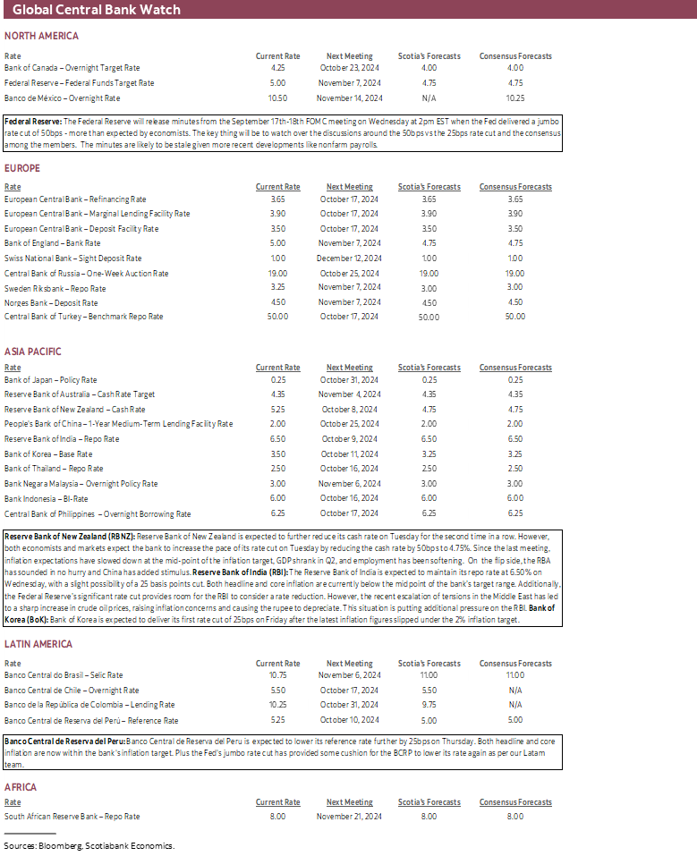 Minutes to the Reserve Bank of Australia’s meeting on September 25th arrive Monday. The RBA sounded in no rush to alter its policy stance and said the 2–3% inflation target is not expected to be sustainably achieved until 2026. The RBA argued that policy easing abroad is happening because other central banks were more restrictive than the RBA. On the same day as the RBA meeting, however, Chinese authorities began announcing a series of measures in an attempt to stimulate the economy (recap here). We’re still waiting for the next shoe to drop in the form of promised fiscal easing. Developments in China’s economy and markets are material to Australia’s economy and so in that sense the minutes could have somewhat of a dated feel, though one that adds to the sentiment that the RBA is in no rush to ease.
