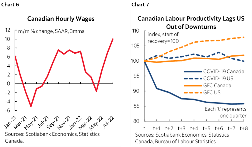 6. Canadian wage growth is exceeding inflation and running at 10% on a m/m annualized basis over the past three months which is double that of the US pace of wage gains (chart 6). Further, Canadian labour productivity is tanking relative to the US (chart 7). Canadians are getting paid more to produce less at a much quicker pace than Americans and that's inflationary. Canada's labour market—even with 3 months of mild declines—remains considerably tighter than the US. The combined effects drive more wage-price spiral concerns north of the border than south.