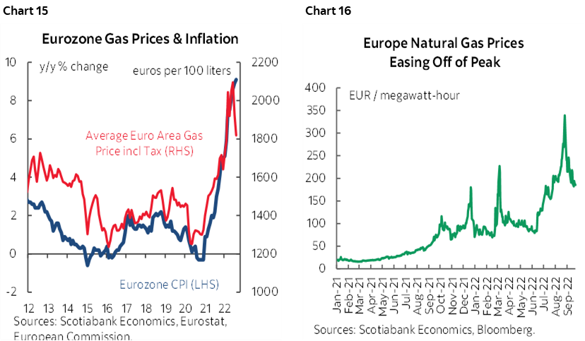 Eurozone CPI will be updated with September’s reading and another hot one is expected with many estimates hovering around 1% m/m. Even as gasoline (chart 15) and natural gas (chart 16) prices have ebbed, administered energy prices are expected to spike higher in Germany as mitigating supports expire such as a sales tax cut. More important will be core CPI that the initial flash is expected to show a further acceleration to 4.7% y/y (4.3% prior). Germany and Spain update CPI on Thursday followed by France and Italy on Friday.