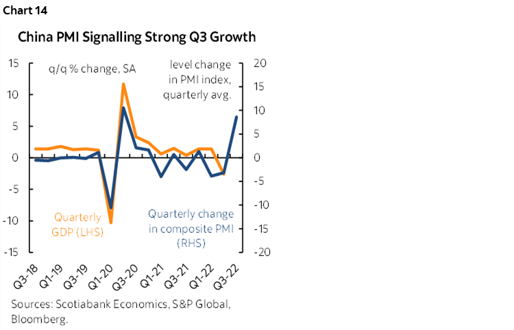 China will update the state’s versions of its purchasing managers’ indices on Thursday night (eastern time as always in this report). They will likely show continued moderate expansion in the non-manufacturing sector but no growth in manufacturing. Still, the improvements at the margin may be a positive signal for Q3 GDP growth (chart 14).