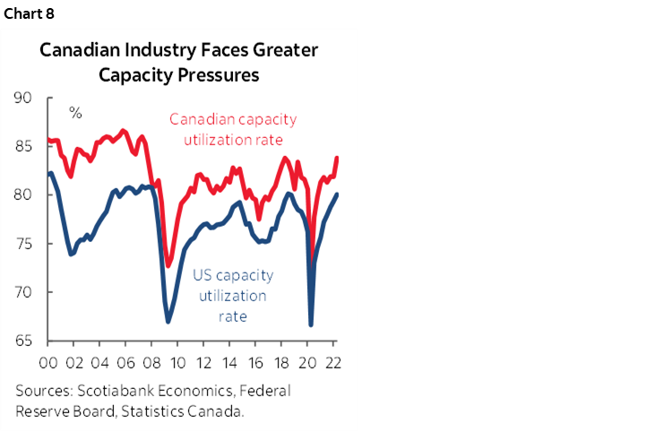 7. Canada has tighter capacity constraints than the US. The economy’s massive outperformance of the US during the first half of this year pushed the economy further into excess aggregate demand while the US contracted. Even Canada's industrial capacity utilization rate is several percentage points higher than the US (chart 8).