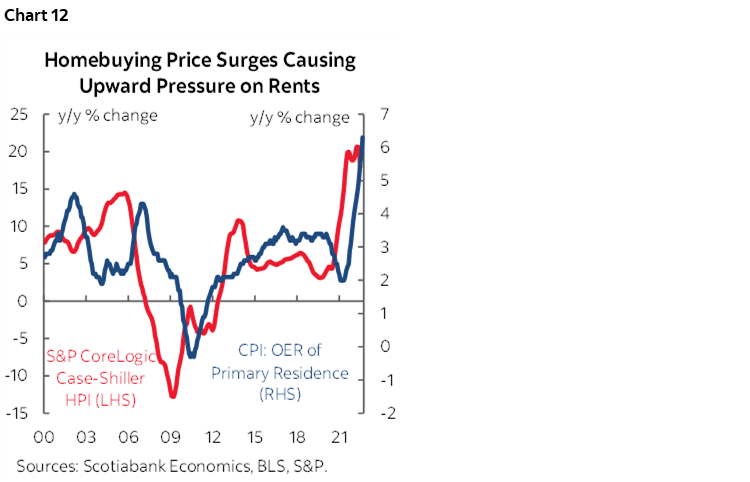 - S&P repeat-sale house prices (Tuesday): July’s lagging tally nevertheless matters because this reading can serve as a leading indicator of what to expect for owners’ equivalent rent in US CPI. As chart 12 demonstrates, we need to see compelling evidence of a turn lower by this measure of house prices before OER’s contributions to overall US inflation begin to ebb and that’s probably well down the read.