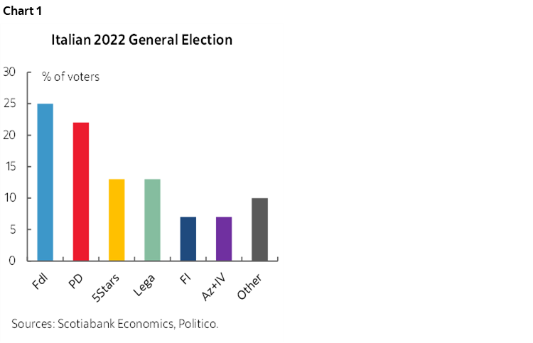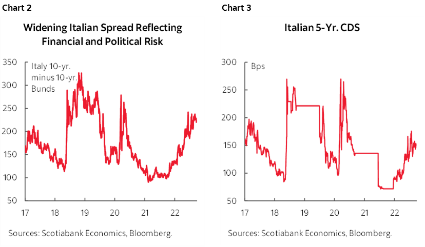 Italians head to the polls on Sunday. A right-wing coalition is widely expected to win (chart 1). It is led by Giorgia Meloni’s Brothers of Italy (light blue bar) and includes Matteo Salvini’s League (green bar) and former PM Silvio Berlusconi’s Forza Italia (dark blue bar). Berlusconi recently threw support behind Vladimir Putin’s war against Ukraine. Meloni has campaigned by using the tricolour flame symbol that evokes memories of Italian dictator Benito Mussolini while saying “I have taken up the baton of a 70-year long history.” She has expressed socially conservative views and opposition to the European Union’s policies when she said “The party for Europe is over.”