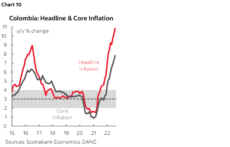 - BanRep (Thursday): Consensus is somewhat divided between expected Colombia’s central bank to hike by 100bps or 150bps. Core inflation recently spiked 0.8% m/m higher in August and took the year-over-year rate up by about ½% to 7.8% and with total CPI up 10.8% y/y for the hottest reading since April 1999 (chart 10)
