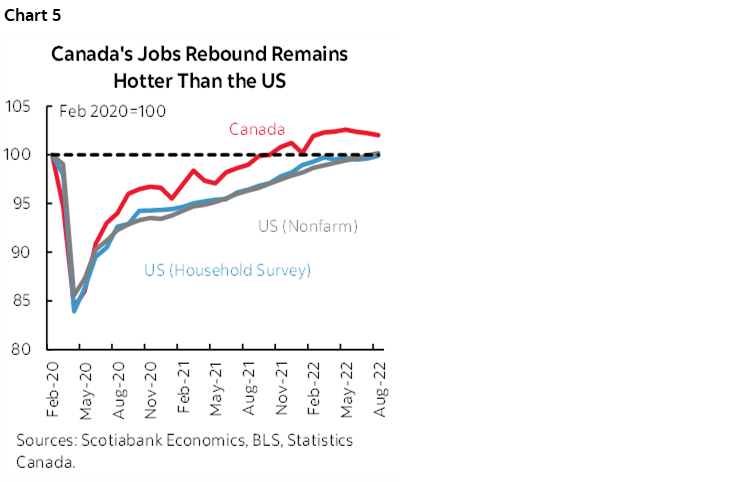 2. Jobs are being lost while they are still rising in the US which means more downside to Canada’s economy and more labour slack. Chart 5 shows that Canada’s jobs rebound remains hotter than the US. Further, at least some of the recent mild decline in Canadian jobs appears to be unreliable distortions to us.