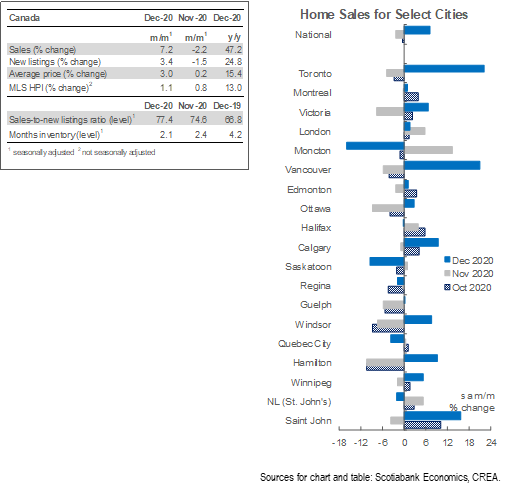 Canadian home sales rose by 7.2% (sa m/m) in December 2020 to set a new monthly record and complete an annual gain of 12.6%. That somewhat surprising climb—new measures to combat COVID-19’s second wave had come into effect across much of the country in December—brought to an end a string of two consecutive monthly decreases. As new listings increased by just 3.4% (sa m/m), the national-level sales-to-new listings ratio rose to 77.4%—the fourth-strongest reading on record. With supply-demand balances strongly in favour of sellers, the composite MLS Home Price Index (HPI) surged by 13% (nsa y/y)—the steepest rise since June 2017. Single-family homes continued to anchor price appreciation.